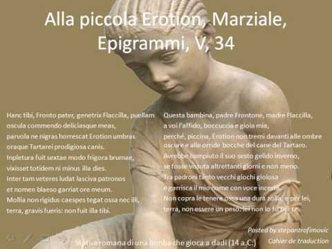 In questo epigramma, Marziale esprime il suo dolore per la morte prematura di Erotion, una bambina di soli sei anni. La ragazza era una schiava che aveva un posto speciale nel cuore del poeta, probabilmente non solo per il suo ruolo domestico, ma anche per l’affetto che suscitava. Questo epigramma si distingue per la sua tenerezza e per l’assenza di sarcasmo o ironia, elementi che invece caratterizzano molti degli epigrammi di Marziale.