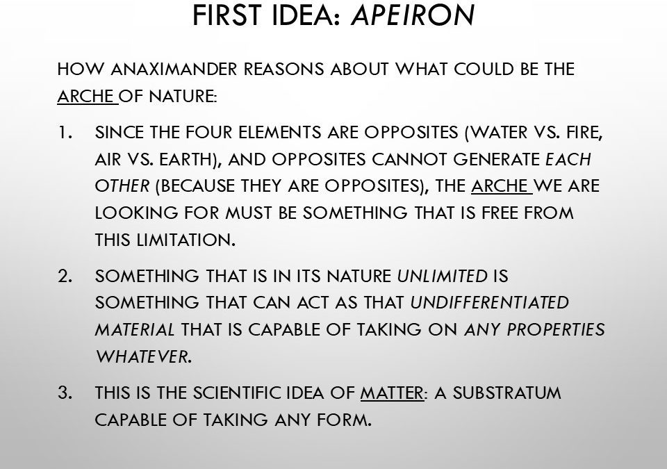 - Apeiron: Come abbiamo visto, l’apeiron è il principio originario da cui tutto ha origine.