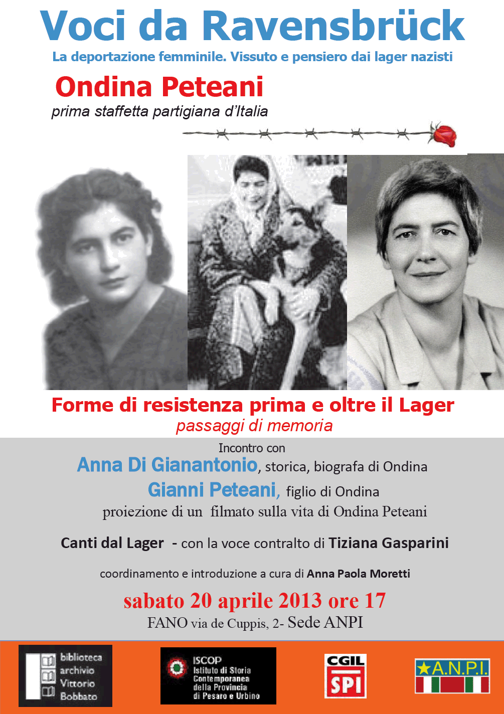 “Ondina Peteani. La deportazione femminile. Vissuto e pensiero dai Lager nazisti” – rievocazione a FANO sabato 20 aprile 2013, volantino in gif