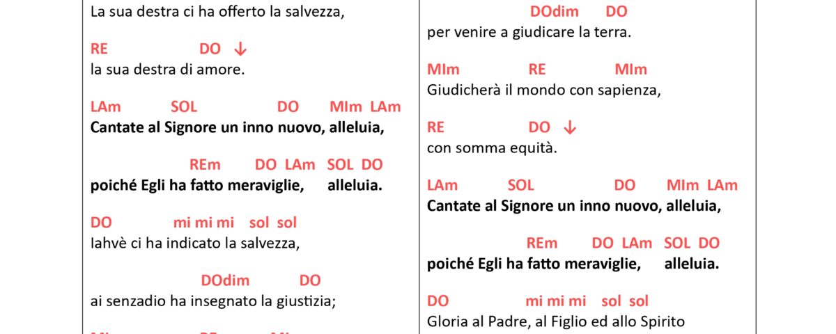 Cantate al Signore un inno nuovo, alleluia, poiché Egli ha fatto meraviglie, alleluia.