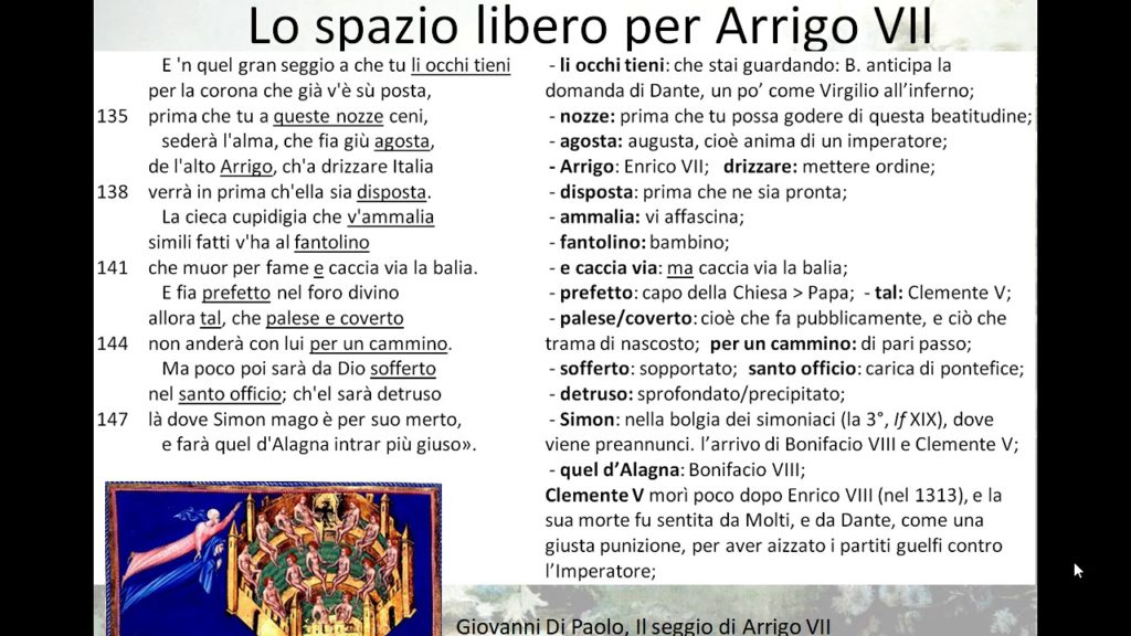 - Il poeta profetizza l’arrivo nell’Empireo di Enrico VII di Lussemburgo, futuro imperatore, visto da Dante come l’unico capace di restaurare la giustizia in Italia. La corona sul seggio è già pronta, segno che il suo destino è segnato dalla Provvidenza.