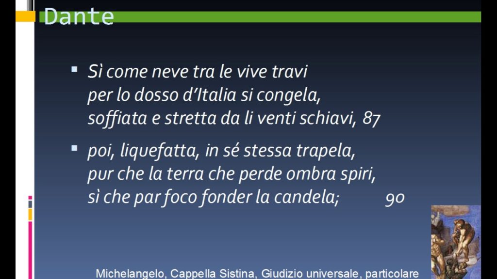 “Dante, perché Virgilio se ne vada, Quasi ammiraglio che in poppa e in prora in su la sponda del carro sinistra, vidi la donna che pria m’appario Tutto che ’l vel che le scendea di testa, regalmente ne l’atto ancor proterva “Guardaci ben! Ben son, ben son Beatrice. Li occhi mi cadder giù nel chiaro fonte; Così la madre al figlio par superba, Ella si tacque; e li angeli cantaro Sì come neve tra le vive travi poi, liquefatta, in sé stessa trapela, così fui sanza lagrime e sospiri ma poi che ’ntesi ne le dolci tempre lo gel che m’era intorno al cor ristretto, Ella, pur ferma in su la detta coscia “Voi vigilate ne l’etterno die, onde la mia risposta è con più cura Non pur per ovra de le rote magne, ma per larghezza di grazie divine, questi fu tal ne la sua vita nova Ma tanto più maligno e più silvestro Alcun tempo il sostenni col mio volto: Sì tosto come in su la soglia fui Quando di carne a spirto era salita, e volse i passi suoi per via non vera, Né l’impetrare ispirazion mi valse, Tanto giù cadde, che tutti argomenti Per questo visitai l’uscio d’i morti, Alto fato di Dio sarebbe rotto, di pentimento che lagrime spanda”. |