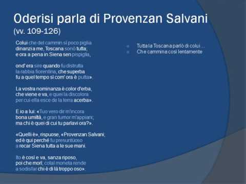 Oderisi poi menziona Provenzan Salvani, un condottiero senese, che si trova anch’egli nel Purgatorio perché fu troppo presuntuoso nel tentativo di controllare Siena. Dante si meraviglia della presenza di Salvani nell’Antipurgatorio, poiché credeva che le anime che non si fossero pentite in vita dovessero attendere molto prima di iniziare la purificazione. Oderisi gli spiega che Salvani, in vita, compì un atto straordinario di umiltà: per salvare un amico dalla prigionia, si umiliò pubblicamente chiedendo l’elemosina nella piazza di Siena. Questo atto eroico gli ha permesso di abbreviare il tempo della sua espiazione.