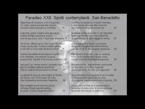 Parafrasi Sorpreso e sopraffatto dallo stupore, E lei, come una madre che accorre mi disse: «Non sai che sei in cielo? Ora puoi capire come ti avrebbero cambiato Se avessi compreso bene le parole di quelle anime, La giustizia divina non colpisce né troppo presto Ma adesso guarda altrove, Come lei volle, tornai a guardare Io restavo lì, trattenendo la voglia di parlare, Ma la più luminosa e splendente tra quelle luci Poi sentii una voce dentro quella luce: Ma per non farti perdere tempo Quel monte sulla cui costa sorge il monastero di Cassino Io sono colui che per primo portò lassù E fui così favorito dalla grazia divina Tutti questi altri spiriti ardenti Qui è Maccario, qui è Romualdo E io gli dissi: «L’affetto che mi mostri hanno allargato la mia fiducia, Perciò ti prego, padre, dimmi Ed egli rispose: «Fratello, il tuo grande desiderio |
