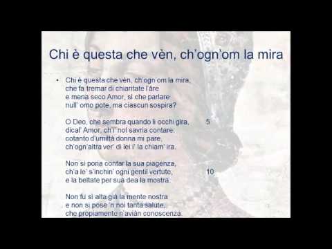 Chi è questa che vèn ch’ogn’om la mira, O Deo, che sembra quando li occhi gira! Non si poria contar la sua piagenza, Non fu sì alta già la mente nostra |