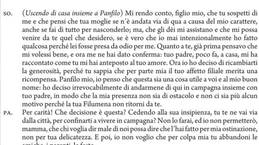 - Rispetto per i legami familiari: Nonostante le incomprensioni iniziali, Sostrata rispetta il legame matrimoniale tra Pamphilus e Philumena e non cerca di interferire negativamente. Questa sensibilità nei confronti dei rapporti familiari dimostra una maturità e una saggezza che contrastano con il ruolo tradizionale della suocera gelosa o oppressiva spesso presente nelle commedie antiche. Anzi, la sua preoccupazione è sempre rivolta al benessere della famiglia e al mantenimento dell’armonia domestica.