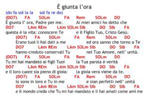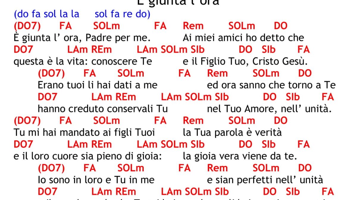 FA SIb FA [1.] è giunta l'ora Padre per me REm SIb SIb6 i miei amici affido a te DO9 LAm REm LAm la vera vita o Padre sei tu SIb DO DO9 FA col Figlio tuo Cristo Gesù. FA SIb FA [2.] Erano tuoi, li hai dati a me REm SIb SIb6 ed ora sanno che torno a te DO9 LAm REm LAm hanno creduto, conservali tu SIb DO DO9 FA nel tuo amore, nell'unità. FA SIb FA [3.] Tu mi hai mandato ai figli tuoi REm SIb SIb6 la tua parola è verità. DO9 LAm REm LAm E il loro cuore sia pieno di gioia SIb DO DO9 FA la gioia vera viene da te. FA SIb FA [4.] Io sono in loro e tu in me; REm SIb SIb6 che sian perfetti nell'unità; DO9 LAm REm LAm e il mondo creda che tu mi hai mandato; SIb DO DO9 FA li hai amati come ami me.