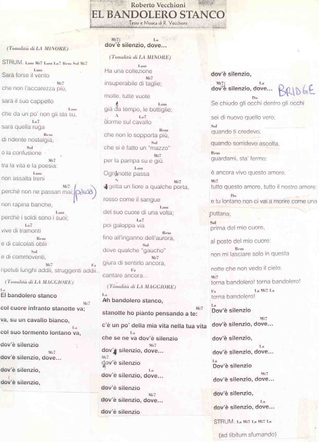 A morire come una puttana Prima del mio cuore Al posto del mio cuore Non mi lasciare solo in questa Notte che non vedo il cielo Torna bandolero! Torna bandolero Torna bandoleroDov’è silenzio