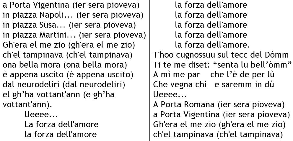 • Le ripetizioni (“la forza dell’amore”, “el gh’ha vottant’ann”) creano un ritmo ipnotico e teatrale.
