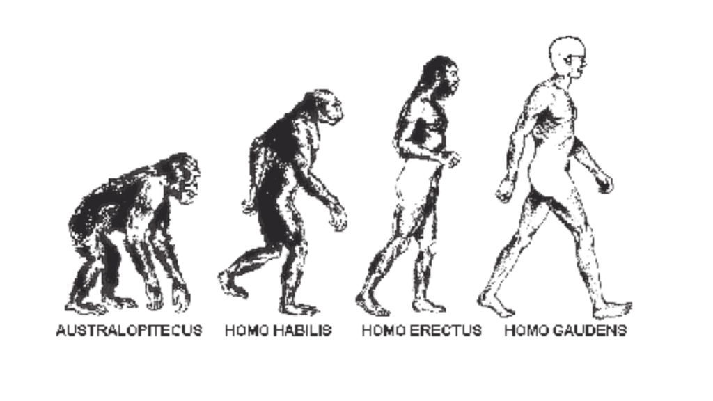 L’evoluzione dell’uomo fino all’homo gaudens, ex sfondo del sito www.gaudio.org, elaborata nel 2002