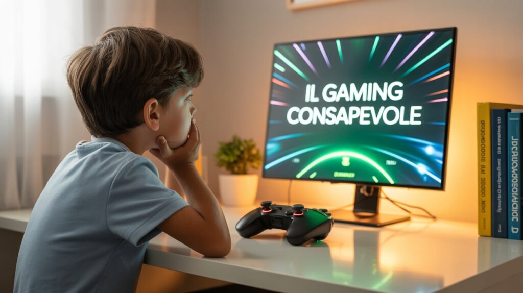 Gaming consapevole = giocare con intelligenza, equilibrio e spirito critico, senza cadere nella dipendenza né rifiutare a priori i videogiochi.