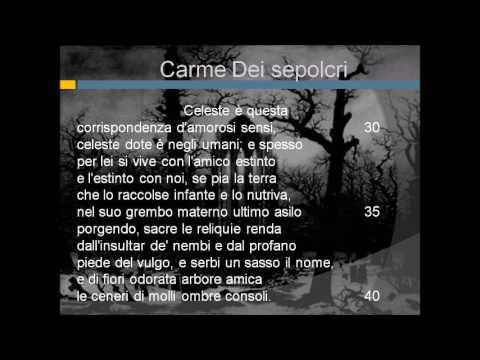 Testo All’ombra de’ cipressi e dentro l’urne Tutte cose l’obblio nella sua notte; Sol chi non lascia eredità d’affetti Pur nuova legge impone oggi i sepolcri Forse tu fra plebei tumuli guardi 70 Rapían gli amici una favilla al Sole Pietosa insania che fa cari gli orti 130 Ma ove dorme il furor d’inclite geste A egregie cose il forte animo accendono |