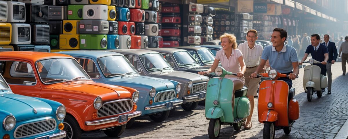 - Simboli del nuovo benessere e modernizzazione: Questi beni rappresentano l’accesso a un nuovo livello di comfort e mobilità per le famiglie italiane. La Cinquecento, la Vespa, gli elettrodomestici non erano solo prodotti, ma icone di uno stile di vita più moderno e agiato, che sostituiva i modi di vita più austeri del dopoguerra.