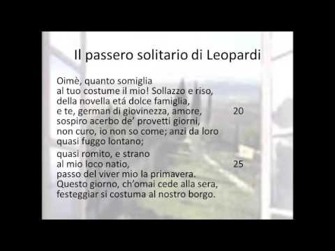 Struttura e contenuto: “Il passero solitario” è una poesia composta da 57 versi distribuiti in tre strofe di lunghezza diseguale, scritta in endecasillabi sciolti. La poesia è caratterizzata da una forte carica emotiva e riflessiva, tipica dello stile di Leopardi.