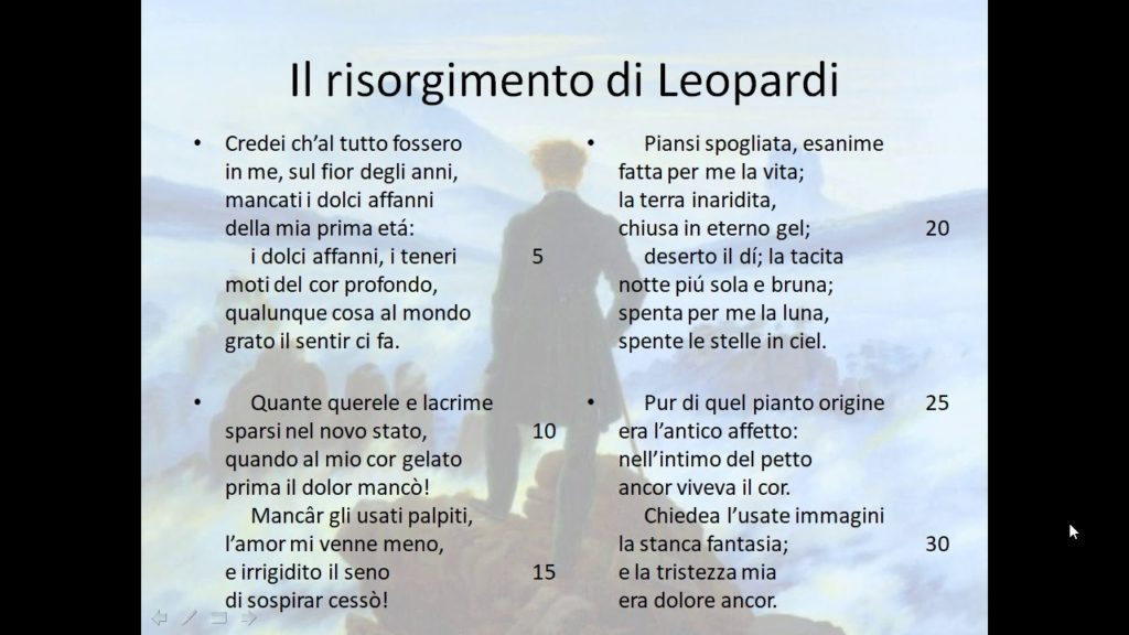 “Il Risorgimento” è una delle poesie più intime di Leopardi, in cui descrive il suo rapporto con le emozioni e con la vita. Dopo un periodo di totale apatia e indifferenza, il poeta riscopre la capacità di provare sentimenti, sebbene sappia che sono illusioni.