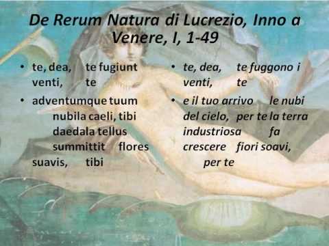O Venere, madre dei discendenti di Enea, delizia degli uomini e degli dei, tu che, sotto le stelle mobili del cielo, popoli il mare navigabile e le terre fertili, poiché grazie a te ogni specie vivente è concepita e, nata, vede la luce del sole: davanti a te, o dea, fuggono i venti, davanti a te e al tuo arrivo si dileguano le nuvole del cielo, per te la terra ingegnosa fa spuntare dolci fiori, per te sorridono le distese del mare e il cielo rasserenato splende di diffusa luce.