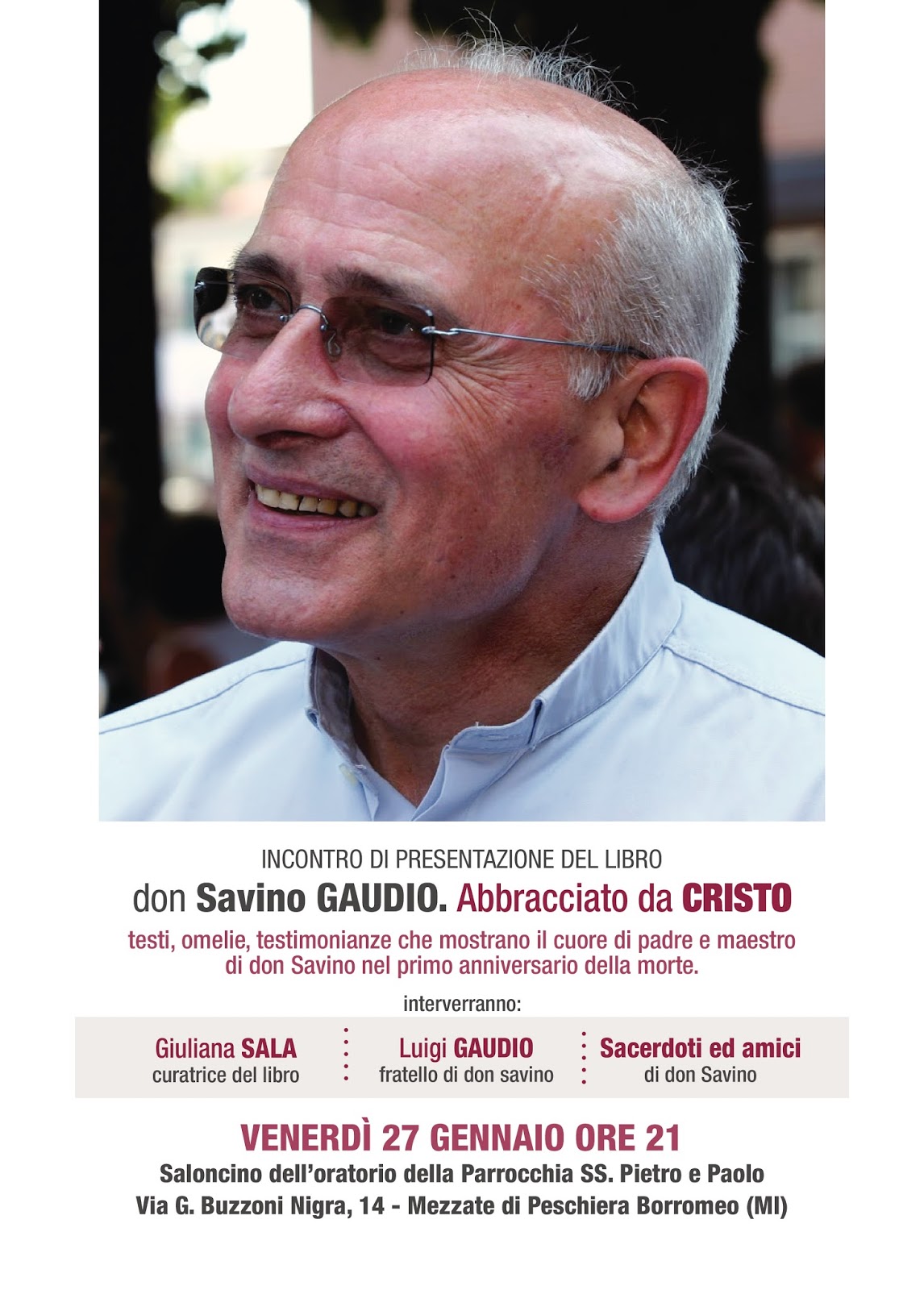 21 Gennaio 2017Peschiera Borromeo – Venerdì 27 gennaio alle ore 21 nel salone dell’oratorio della Parrocchia SS. Pietro e Paolo in Via G Buzzoni Nigra, 14, nella frazione di Mezzate, si terrà un incontro sul tema “Don Savino Gaudio. Abbracciato da Cristo” . Interverranno il fratello Luigi, Giuliana Sala, curatrice del libro, sacerdoti e altri amici. Sarà infatti presentato il libro che ripropone testi ed omelie di don Savino, mostrando il suo cuore di padre e maestro.