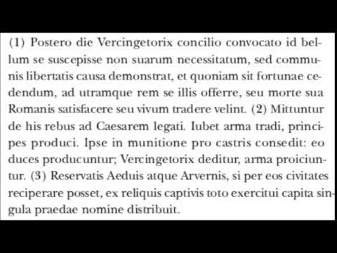 TraduzioneIl giorno seguente, Vercingetorige, convocato il consiglio, dichiarò che aveva intrapreso quella guerra non per necessità personali, ma per la causa della libertà comune, e poiché la fortuna andava accettata, si offriva a loro per entrambe le opzioni: soddisfare i Romani con la sua morte o essere consegnato vivo, a loro discrezione. Vengono inviati ambasciatori a Cesare per trattare queste questioni. Cesare ordina che le armi vengano consegnate e che i capi siano condotti davanti a lui. Si siede sul terrapieno davanti al campo fortificato: i comandanti vengono portati davanti a lui; Vercingetorige si consegna, e le armi vengono gettate a terra. Dopo aver risparmiato gli Edui e gli Arverni, se avesse potuto riconquistare tramite loro altre città, distribuisce i prigionieri rimanenti come bottino di guerra, assegnando un prigioniero per ciascun soldato dell’esercito. |