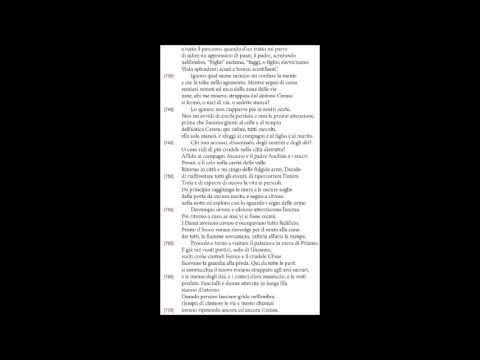 Durante la notte in cui Troia viene conquistata e devastata dai Greci, Enea, avvertito in sogno dall’ombra di Ettore, viene esortato a fuggire dalla città in fiamme. Dopo una prima resistenza e il desiderio di combattere fino alla morte per difendere la patria, Enea si convince a lasciare Troia, spinto anche dall’apparizione della madre Venere, che gli mostra gli dèi stessi intenti a distruggere la città. Enea si prepara così a fuggire, portando con sé il vecchio padre Anchise, il figlioletto Ascanio (Iulo) e la moglie Creusa.