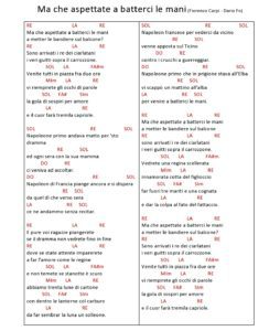 Napoleon francese per vederci da vicino RE SOL venne apposta sul Ticino DO RE contro i crucchi a guerreggiar. DO RE SOL Napoleone primo che in prigione stava all’Elba RE SOL vi scappò un mattino all’alba LA RE SOL per venire a batterci le mani.