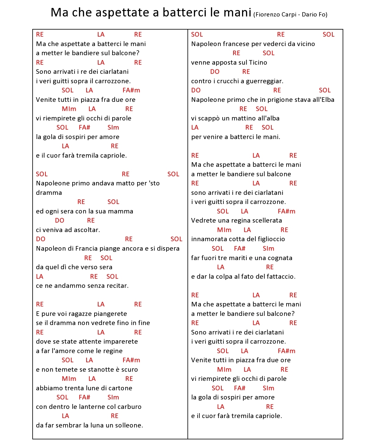 Ma che aspettate a batterci le mani a metter le bandiere sul balcone? RE LA RE Sono arrivati i re dei ciarlatani i veri guitti sopra il carrozzone. SOL LA FA#m Venite tutti in piazza fra due ore MIm LA RE vi riempirete gli occhi di parole SOL FA# SIm la gola di sospiri per amore LA RE e il cuor farà tremila capriole.