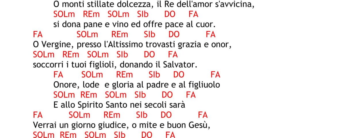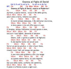 Sol Re Sol Mim Lam Re Sol Osanna al Figlio di David, osanna al Redentor! Sol Re Sol Sol7 Do Re Sol Apritevi, o porte eterne, avanzi il Re della gloria, Re Lam Mim Do Re Sol adori cielo e terra, l'eterno suo poter. O stillate dolcezza, il Re dell'amor s'avvicina, si dona pane e vino ed offre pace al cuor. O Vergine, presso l'Altissimo trovasti grazia e onor, soccorri i tuoi figlioli, donando il Salvator. Verrai un giorno giudice, o mite e buon Gesù, rimetti nostri falli nel tempo del perdon. A una voce sola gridiamo a Dio che venga su questa nostra terra, lui solo a regnar. Sia luce nella notte, conforto nel cammino, il pane e la Parola e pace a ogni cuor.
