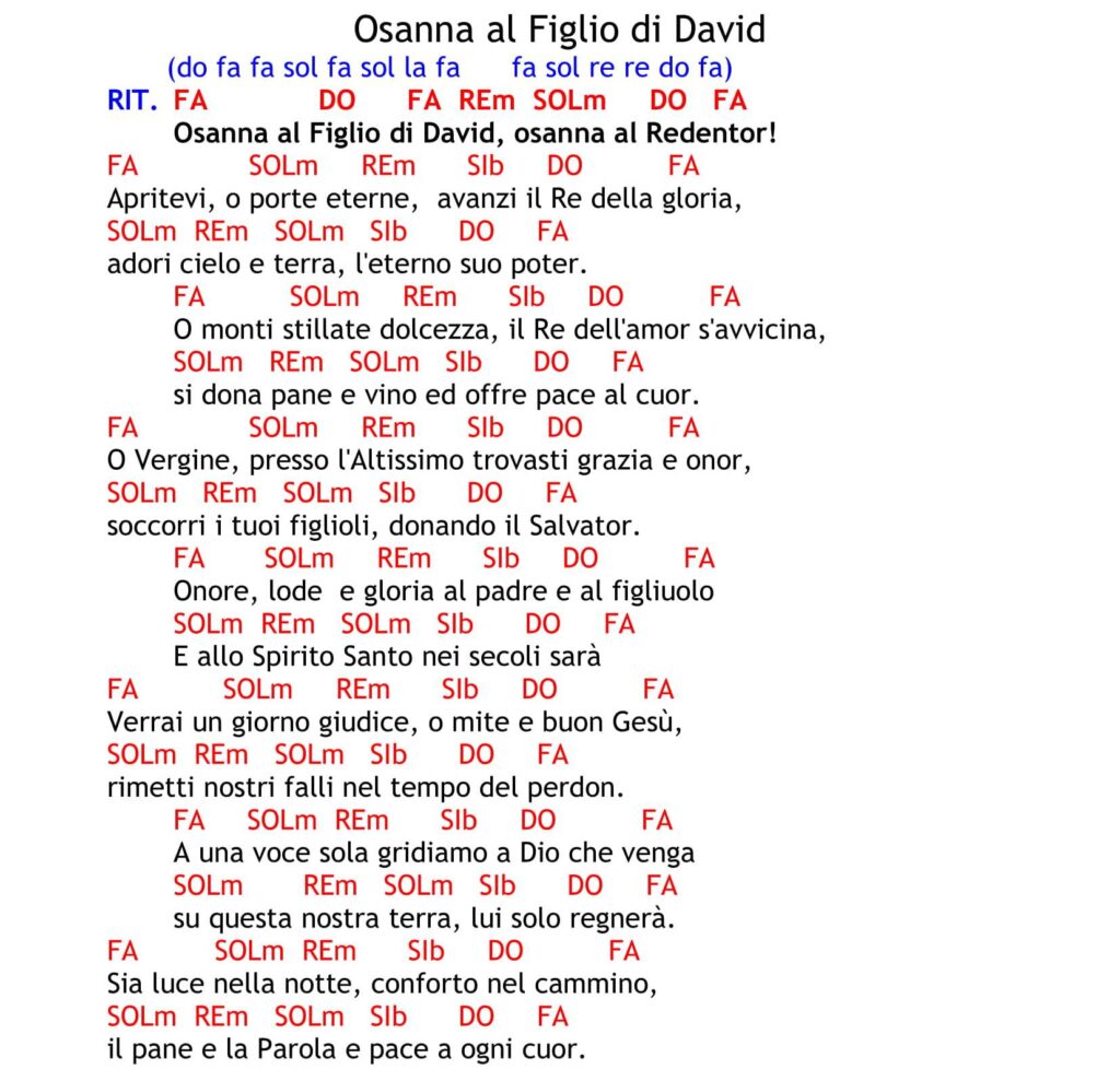 Sol Re Sol Mim Lam Re Sol Osanna al Figlio di David, osanna al Redentor! Sol Re Sol Sol7 Do Re Sol Apritevi, o porte eterne, avanzi il Re della gloria, Re Lam Mim Do Re Sol adori cielo e terra, l'eterno suo poter. O stillate dolcezza, il Re dell'amor s'avvicina, si dona pane e vino ed offre pace al cuor. O Vergine, presso l'Altissimo trovasti grazia e onor, soccorri i tuoi figlioli, donando il Salvator. Verrai un giorno giudice, o mite e buon Gesù, rimetti nostri falli nel tempo del perdon. A una voce sola gridiamo a Dio che venga su questa nostra terra, lui solo a regnar. Sia luce nella notte, conforto nel cammino, il pane e la Parola e pace a ogni cuor.