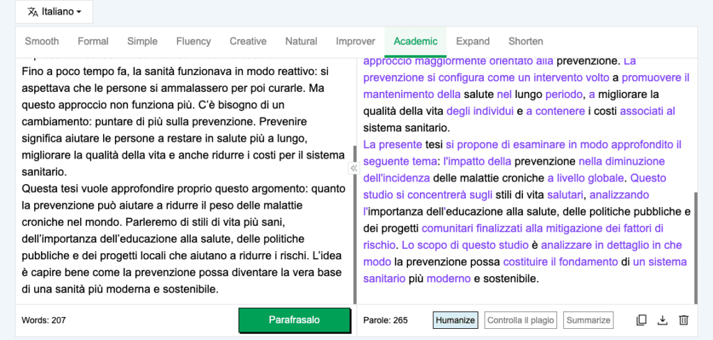 “Abbiamo parafrasato il contenuto dello stile informale, utilizzando la modalità Accademica dello strumento , che ha immediatamente rinnovato il nostro testo e fornito un output con un tono accademico.”