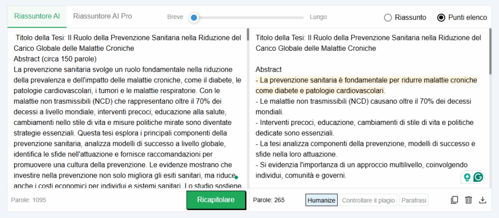 - Puoi scrivere automaticamente abstract o riassunti per la tua tesi in pochi secondi. Tutto ciò che devi fare è incollare il tuo elaborato di tesi nello strumento, impostarne la lunghezza utilizzando la “Barra della lunghezza” e cliccare sul pulsante ” Riepilogo” per iniziare.