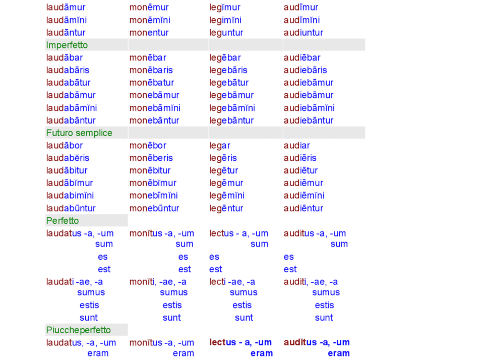Prospetto e tabella delle quattro coniugazioni verbali latine dalle grammatica latina di Carlo Zacco Le quattro coniugazioni verbali Prima (-are) Seconda (-are) Terza (-are) Quarta (-are) […]